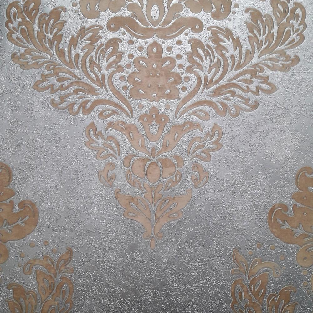 Рисунок обоев представлен в виде узора из вензелей, которые создают эффект изысканности и элегантности. Цветовая гамма обоев сочетает золотой и серый оттенки, что придает помещению изысканность и шарм.